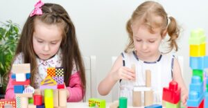 Two little girl playing with building blocks