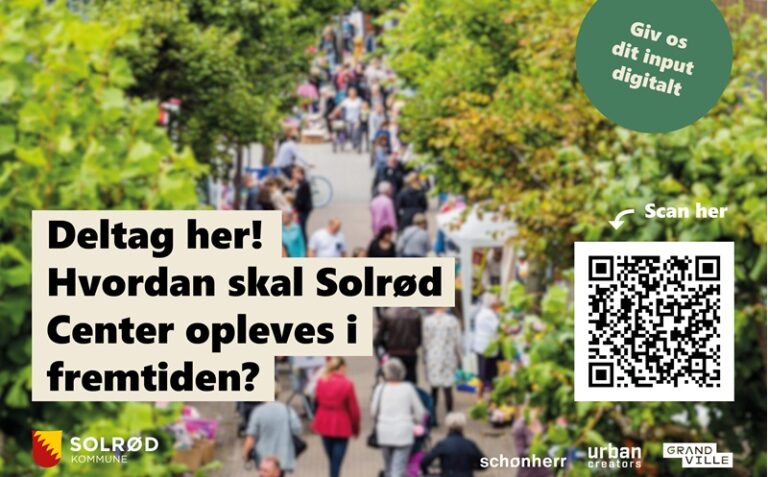 Scan QR koden på billedet eller gå til www.solrod.dk under siden ‘Aktuelle projekter’ og ‘Visionsplan for Solrød Center’ for at komme med dine input