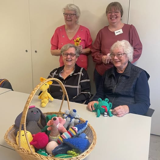 Fire frivillige kvinder – Ulla, Carina, Irene og Søs – gør en forskel for børn i Solrød Kommune ved at strikke og hækle såkaldte trøstebamser til Familiehuset og Familieafdelingen.