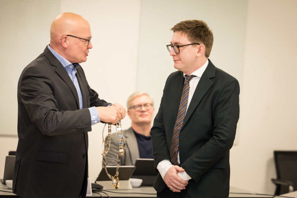 Borgmester Emil Blücher fik traditionen tro hængt borgmesterkæden om halsen som markering af den officielle indtræden i borgmesterembedet, da det ny byråd i Solrød Kommune for første gang trådte sammen ved det konstituerende møde den 1. december 2025.